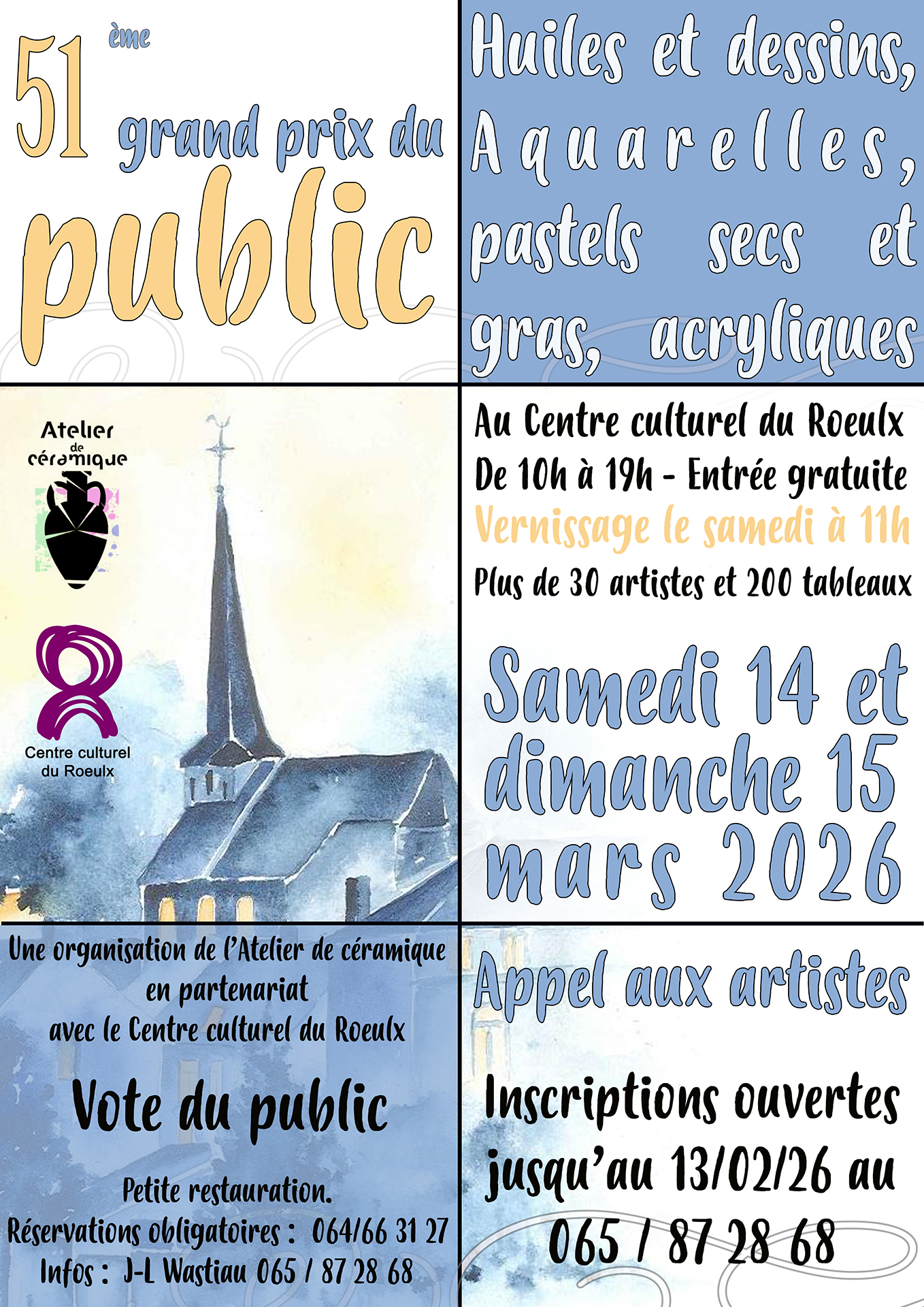 Le samedi 14 et le dimanche 15 mars 2026, au Centre culturel, se tiendra une exposition désormais bien (re)connue : le « Grand Prix du Public », dont la particularité est le vote que les visiteurs peuvent faire pour défendre leurs créations artistiques favorites.