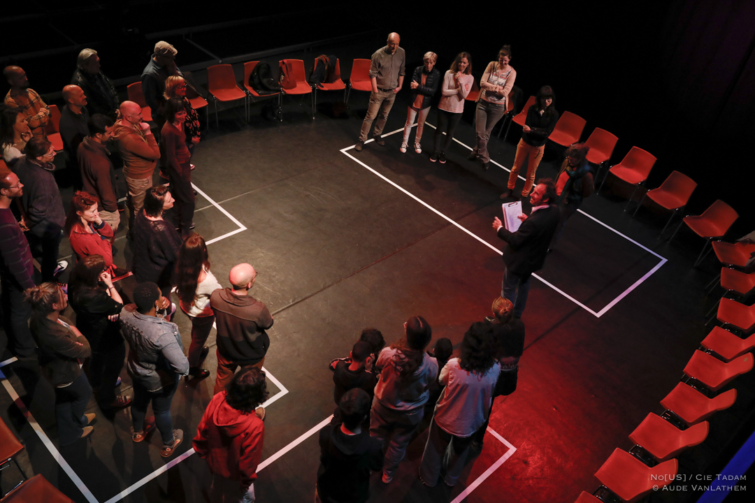 Par-là, ils se reconnaissent dans leurs différentes réponses. C’est l’expérience fondatrice du spectacle. Le public est ensuite invité à s’asseoir, autour de l’aire de jeu, le spectacle a déjà commencé. Des scènes improvisées, nourries de ces réponses, s’enchaînent, se répondent, s’inventent dans l’instant. Par ce dispositif, au centre du public, avec lui, nous cherchons plus que tout la rencontre et la proximité dans l’acte théâtral. C’est No[us], tout simplement!