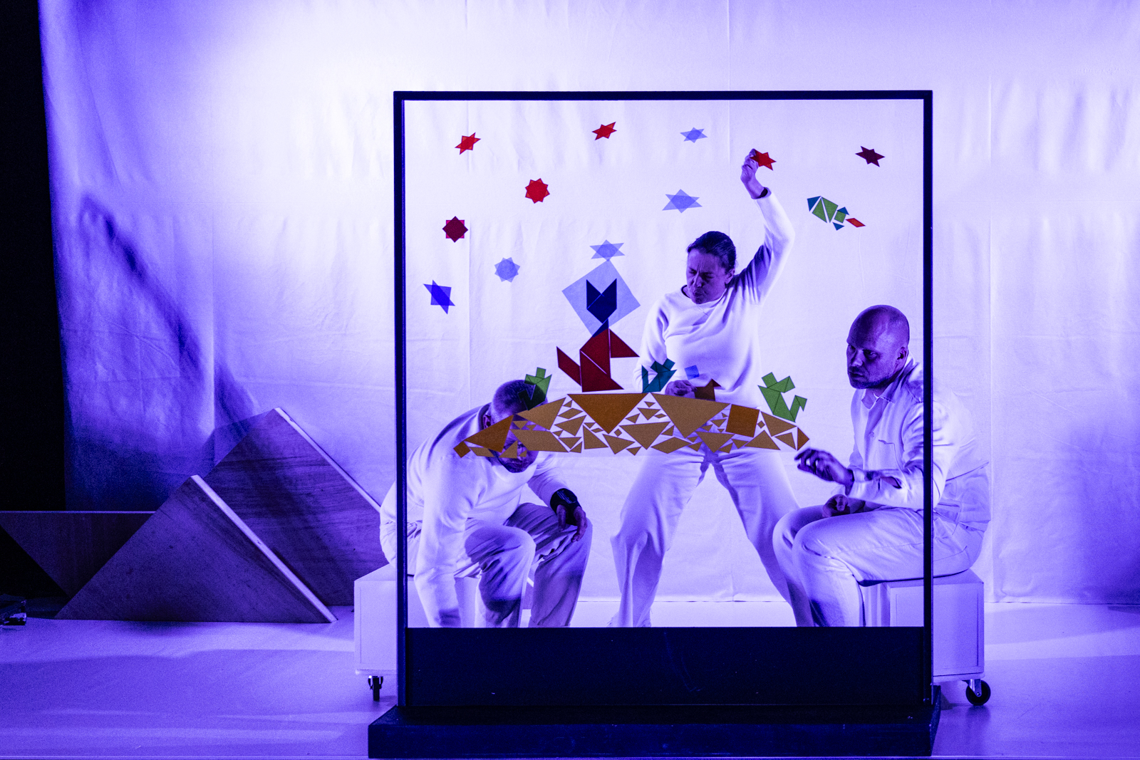 Sur scène, plusieurs tangrams composent l’ensemble des décors et des personnages de l’histoire, celle de Piou-Piou, un oiseau qui ne savait pas voler. Il est le héros de cette petite fable épique, inspirée par celle d’Esope, qui fait l’éloge de la curiosité et de l’ouverture au monde…